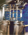 Higher shear rates. Dispersing low density solids. Liquid solids dispersions. Main container mounted on castor wheels for easy mobility. Choice of different designs of beaters to suit the mixing requirements of wide variety of materials. Jacketed bowl for heating and cooling of the products. The main top dish is provided with vacuum connection so as to avoid aeration. Scrappers of suitable design are provided to avoid localized heating and also ensures uniform mixing. A separate control panel is provided with mimic. The mixer is useful for ointment. Paste, cream and lotions. Material of construction - SS 304, SS 316 and M. S. Motorised as well as hydraulic lifting and lowering assembly is also provided for the higher capacity models. Contra rotary mixers for tooth paste can also be supplied. |